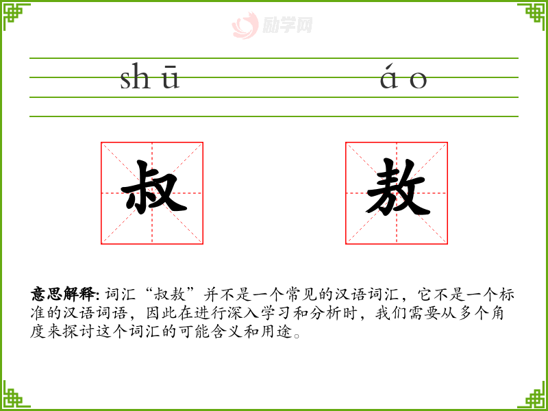 由于“叔敖”不是一个标准词汇,我们无法给出一个确切的字面意思和基本含义。它可能是某个特定方言、古文中的词汇,或者是某个特定文化背景下的术语。