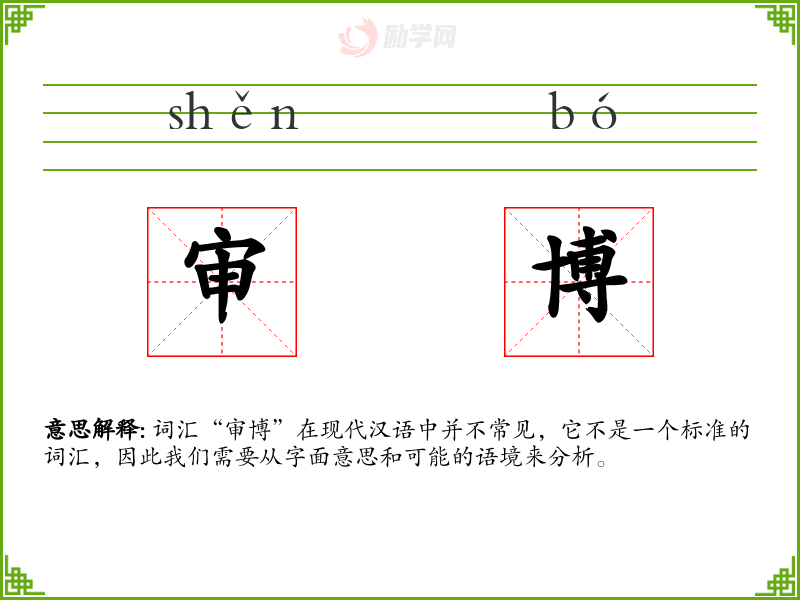 词汇“审博”在现代汉语中并不常见,它不是一个标准的词汇,因此我们需要从字面意思和可能的语境来分析。