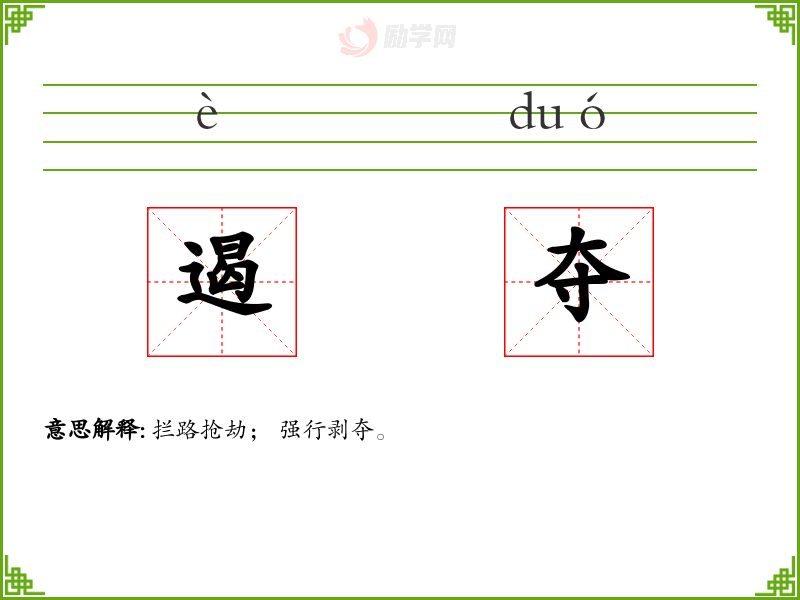 夺[ duó ] 1. (会意。金文字形,上面象振翅欲飞的鸟,下面是手(又、寸),其意思是:这只振翅欲飞的鸟,眼看着就要从手中失脱掉。本义:丧失)。 2. 同本义。 【引证】 《说文》-夺,手持隹失之也。 《礼记·仲尼燕居》。注:“犹乱也。”-给夺慈仁。 《素问·通评虚实论》-精气夺则虚。 《论语·子罕》-三军可夺帅也,匹夫不可夺志也。 《荀子·富国》-勿夺农时。 【组词】 夺宗、 夺气、 夺魄、 夺胆、 夺彩 [更多解释]