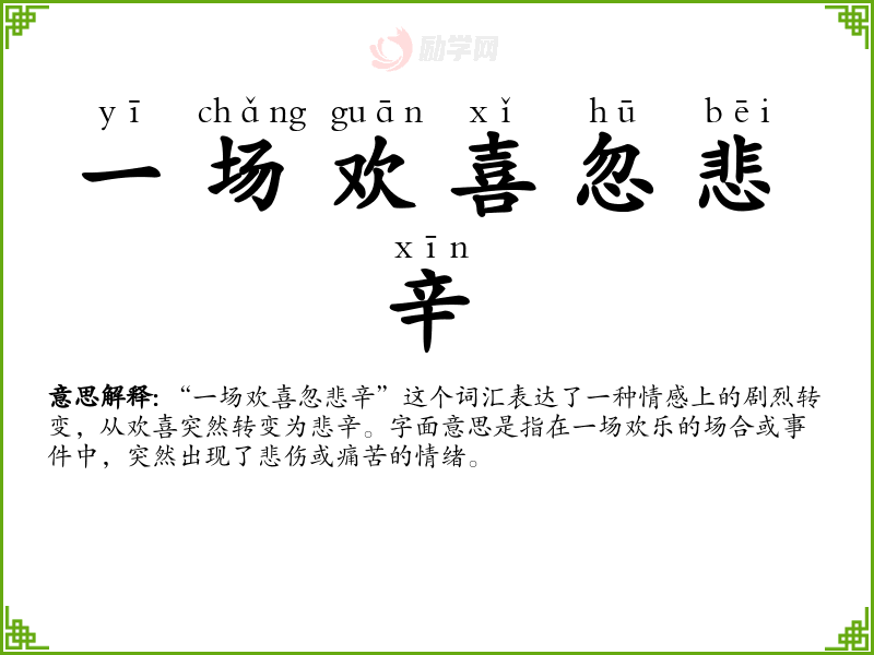 这个词汇可能是现代汉语中的一个合成词,结合了“一场”、“欢喜”和“悲辛”三个词,用以表达情感的快速转变。在古代文学中,类似的表达可能更为隐晦,通过诗词的意象和修辞来传达。