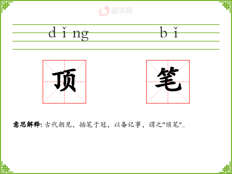 顶笔的意思是:古代朝见,插笔于冠,以备记事,谓之"顶笔"。