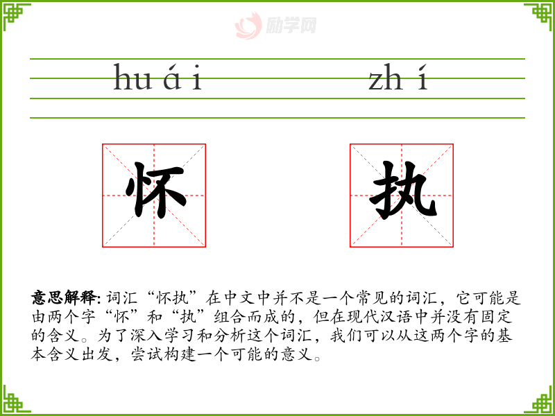 词汇“怀执”在中文中并不是一个常见的词汇,它可能是由两个字“怀”和“执”组合而成的,但在现代汉语中并没有固定的含义。为了深入学习和分析这个词汇,我们可以从这两个字的基本含义出发,尝试构建一个可能的意义。