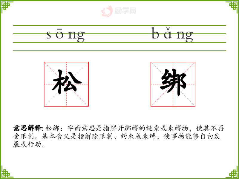 松绑:字面意思是指解开绑缚的绳索或束缚物,使其不再受限制。基本含义是指解除限制、约束或束缚,使事物能够自由发展或行动。