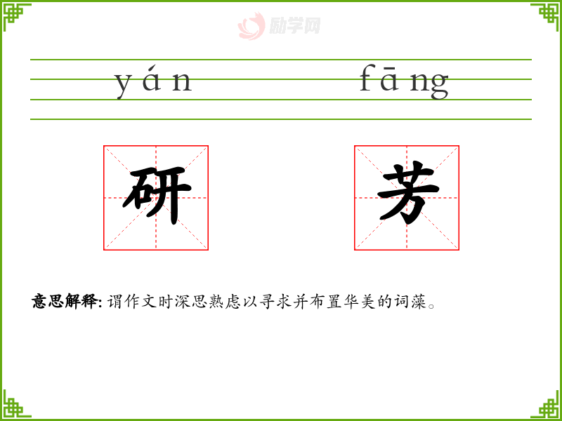 研芳的意思是:谓作文时深思熟虑以寻求并布置华美的词藻。