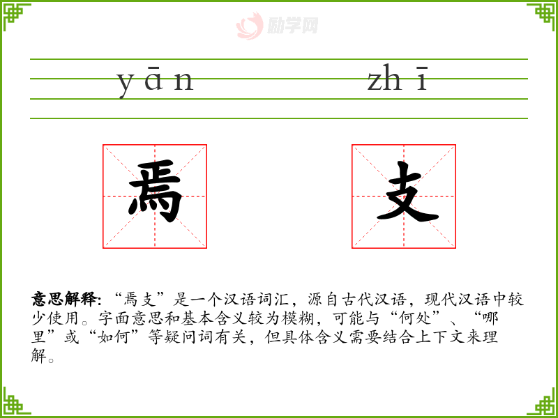 “焉支”是一个汉语词汇,源自古代汉语,现代汉语中较少使用。字面意思和基本含义较为模糊,可能与“何处”、“哪里”或“如何”等疑问词有关,但具体含义需要结合上下文来理解。