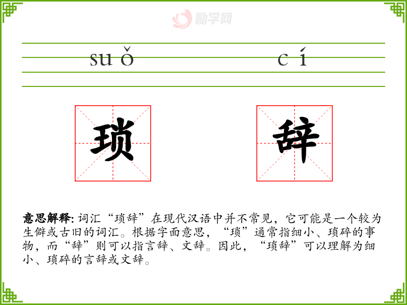 - 视觉上,“琐辞”可能让人联想到杂乱无章的文字堆砌。