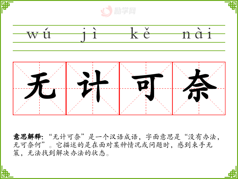 “无计可奈”是一个汉语成语,字面意思是“没有办法,无可奈何”。它描述的是在面对某种情况或问题时,感到束手无策,无法找到解决办法的状态。