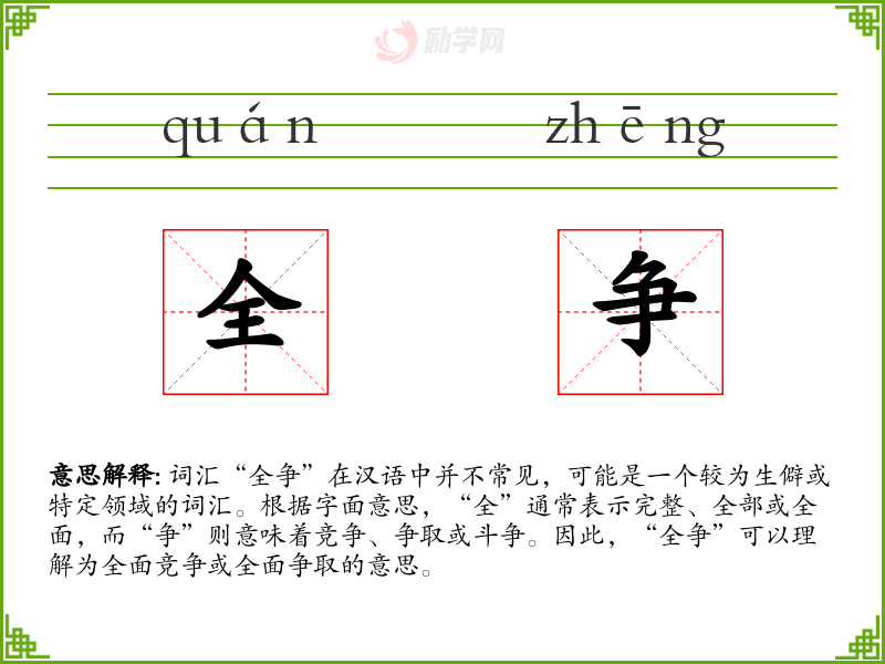 “全争”的字面意思和基本含义是指在所有方面或领域进行竞争或争取,强调的是一种全面性和广泛性。