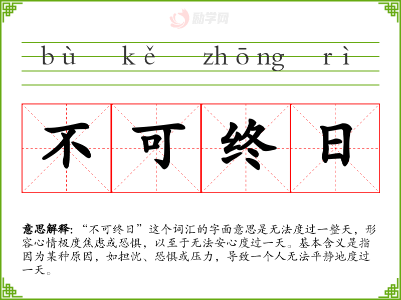 - 文学:在文学作品中,这个词汇常用来描绘人物内心的极度不安或恐惧,如“他因为即将到来的审判而不可终日。”