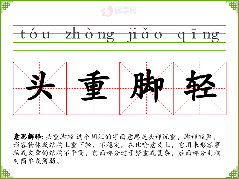 头重脚轻 这个词汇的字面意思是头部沉重,脚部轻盈,形容物体或结构上重下轻,不稳定。在比喻意义上,它用来形容事物或文章的结构不平衡,前面部分过于繁重或复杂,后面部分则相对简单或*弱。