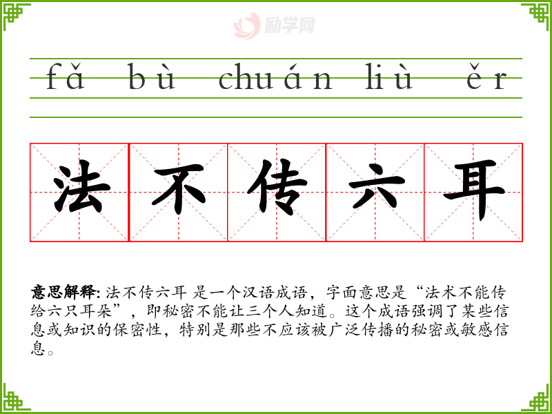 法不传六耳 是一个汉语成语,字面意思是“法术不能传给六只耳朵”,即秘密不能让三个人知道。这个成语强调了某些信息或知识的保密性,特别是那些不应该被广泛传播的秘密或敏感信息。
