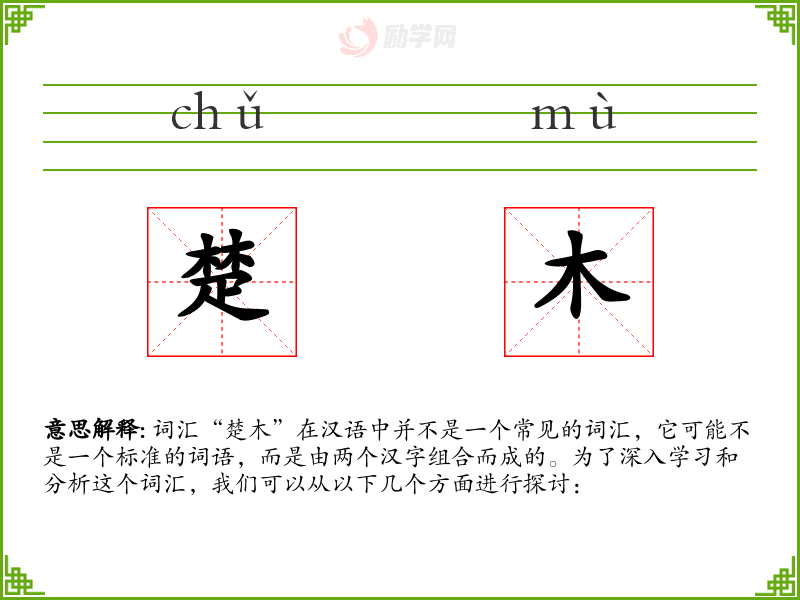 “楚”作为一个地名,有着悠久的历史,而“木”作为树木的通用词汇,也是汉语中的基本词汇。两者的结合可能是文学创作中的一个特定表达。