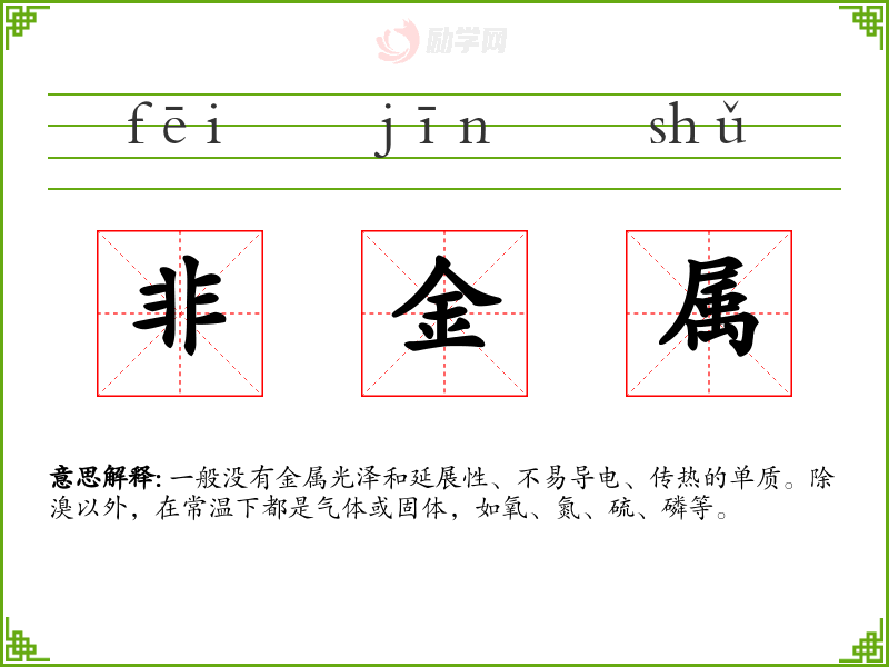 非金属的意思是:一般没有金属光泽和延展性、不易导电、传热的单质。除溴以外,在常温下都是气体或固体,如氧、氮、硫、磷等。