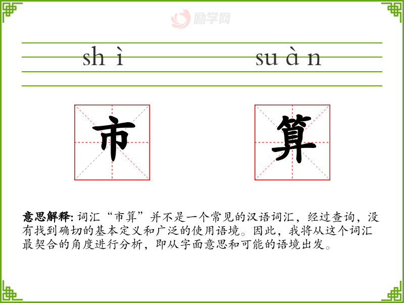 虽然“市算”不是一个常用词汇,但它反映了商业活动中计算和估算的重要性。在语言学习和表达中,了解这类专业术语有助于更好地理解特定领域的语言使用。