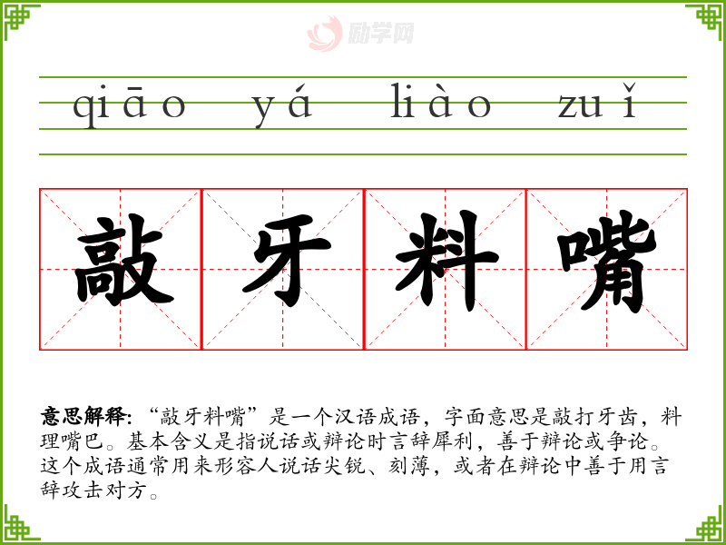 “敲牙料嘴”是一个汉语成语,字面意思是敲打牙齿,料理嘴巴。基本含义是指说话或辩论时言辞犀利,善于辩论或争论。这个成语通常用来形容人说话尖锐、刻*,或者在辩论中善于用言辞攻击对方。