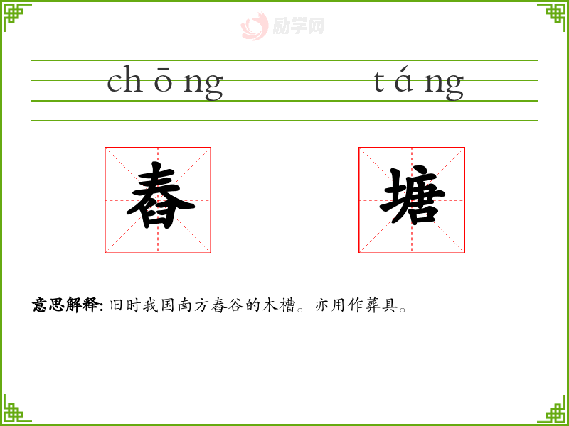 舂塘的意思是:旧时我国南方舂谷的木槽。亦用作葬具。