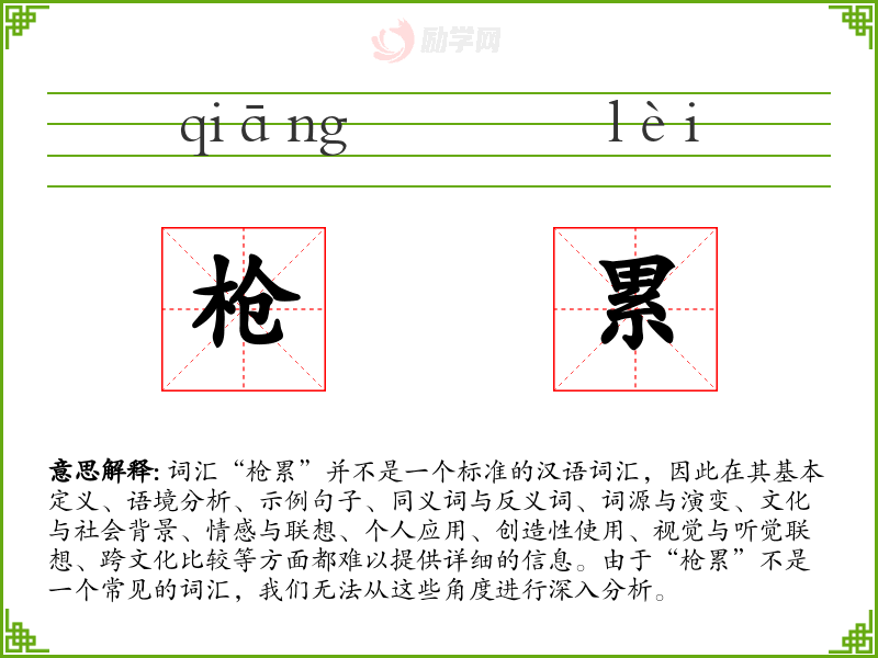 综上所述,由于“枪累”不是一个常见的词汇,我们只能从有限的字面意思出发,尝试对其进行分析。在实际的语言学和使用中,建议关注和学更为标准和常用的词汇。