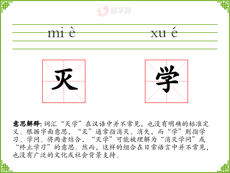 - 词源:由“灭”和“学”两个汉字组合而成,没有特定的历史演变记录。