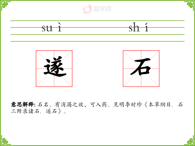 遂石的意思是:石名。有消渴之效,可入药。见明李时珍《本草纲目.石三附录诸石.遂石》。