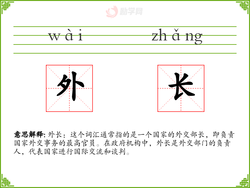 外长:这个词汇通常指的是一个国家的外交部长,即负责国家外交事务的最高官员。在政府机构中,外长是外交部门的负责人,代表国家进行国际交流和谈判。