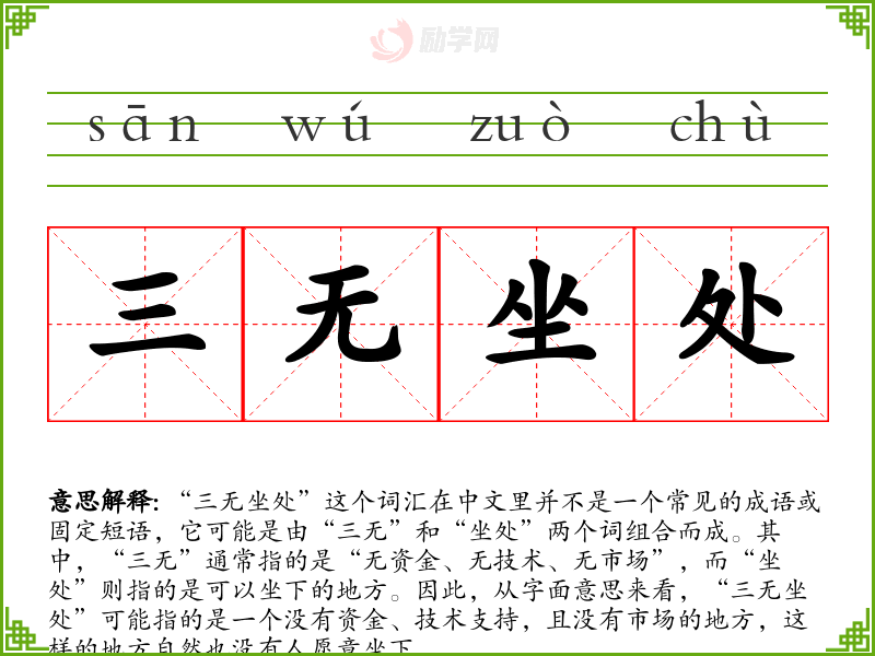 “三无坐处”这个词汇虽然不是一个标准词汇,但它能够形象地描述一种社会经济现象,具有一定的表达力和创造性。在语言学习和表达中,了解和掌握这样的词汇可以帮助我们更准确地表达复杂的概念和情感。