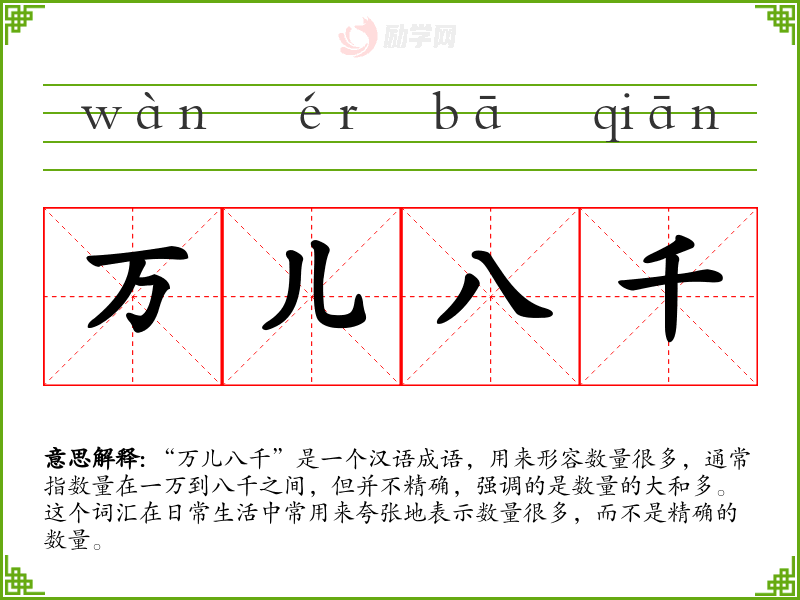 “万儿八千”是一个汉语成语,用来形容数量很多,通常指数量在一万到八千之间,但并不精确,强调的是数量的大和多。这个词汇在日常生活中常用来夸张地表示数量很多,而不是精确的数量。