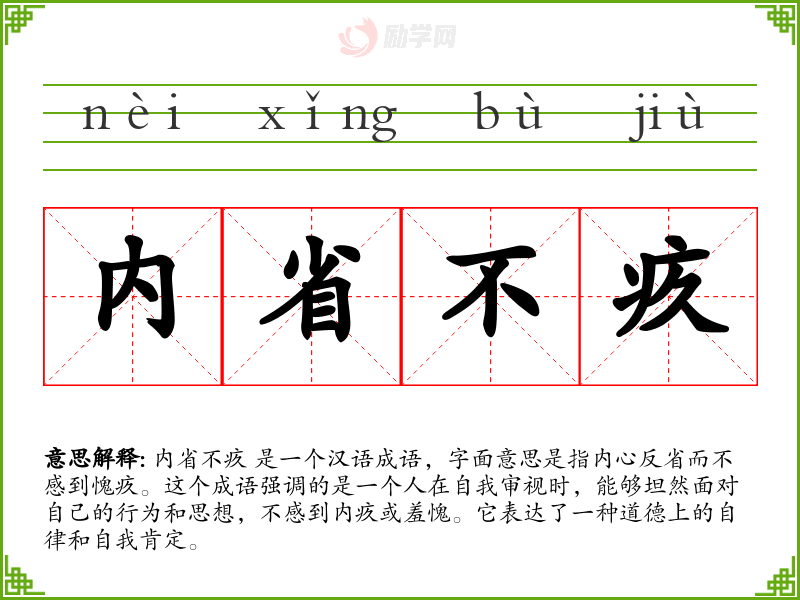 内省不疚 是一个汉语成语,字面意思是指内心反省而不感到愧疚。这个成语强调的是一个人在自我审视时,能够坦然面对自己的行为和思想,不感到内疚或羞愧。它表达了一种道德上的自律和自我肯定。