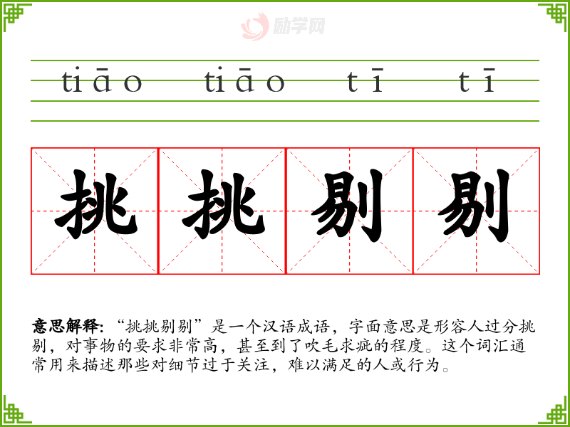 “挑挑剔剔”是一个汉语成语,字面意思是形容人过分挑剔,对事物的要求非常高,甚至到了吹毛求疵的程度。这个词汇通常用来描述那些对细节过于关注,难以满足的人或行为。