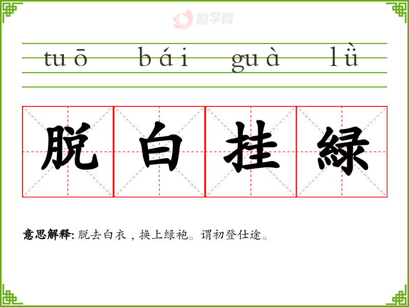 脱白挂緑的意思是:脱去白衣﹐换上绿袍。谓初登仕途。