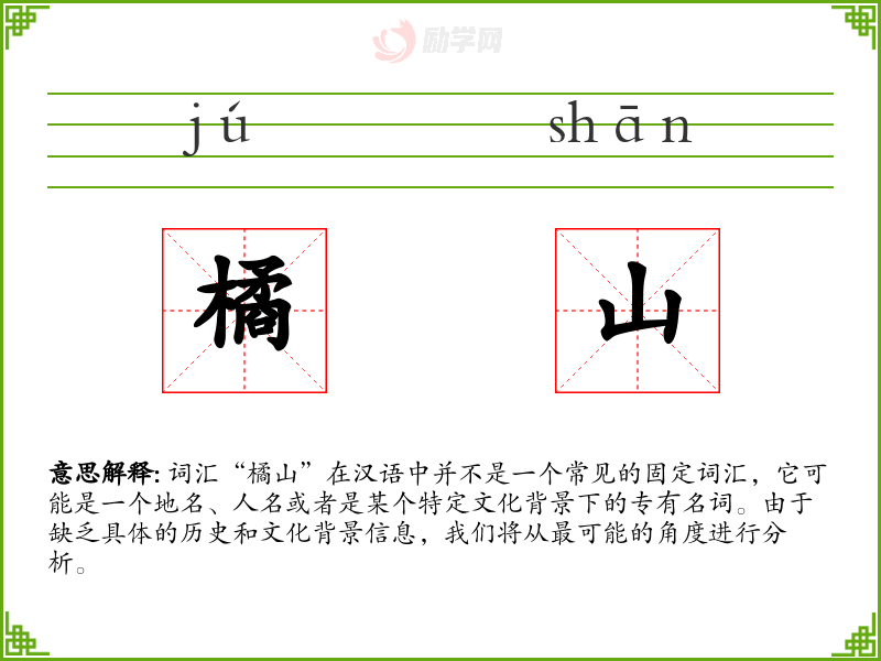 词汇“橘山”在汉语中并不是一个常见的固定词汇,它可能是一个地名、人名或者是某个特定文化背景下的专有名词。由于缺乏具体的历史和文化背景信息,我们将从最可能的角度进行分析。