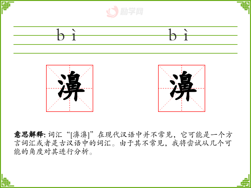 词汇“[濞濞]”在现代汉语中并不常见,它可能是一个方言词汇或者是古汉语中的词汇。由于其不常见,我将尝试从几个可能的角度对其进行分析。