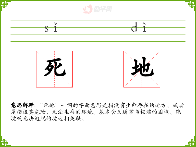 通过对“死地”一词的深入学和分析,可以更好地理解其在不同语境下的使用和意义。在语言学和表达中,掌握这类词汇有助于丰富表达方式,增强语言的情感和描述能力。