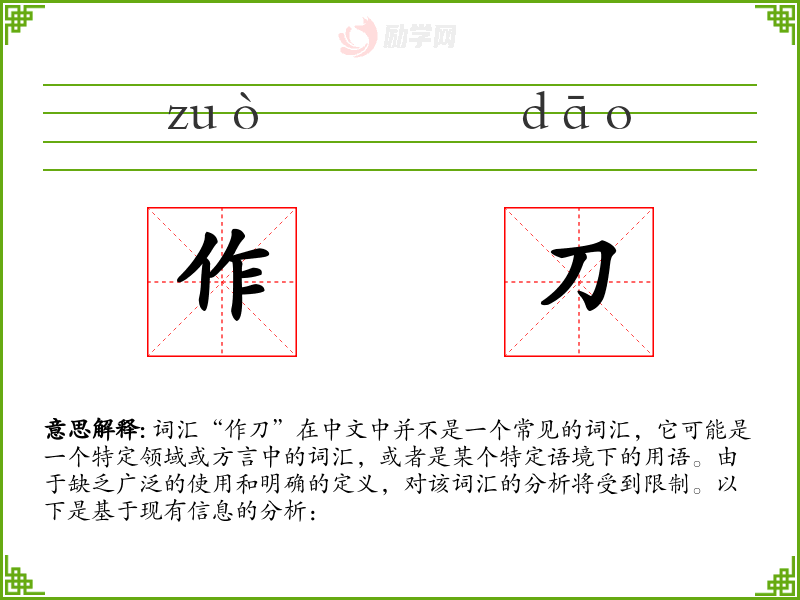 由于“作刀”不是一个常见的词汇,对其的理解和分析受到限制。在语言学习和表达中,了解词汇的明确含义和使用语境是非常重要的。对于不明确的词汇,建议查找更多资料或询问专业人士以获得准确信息。