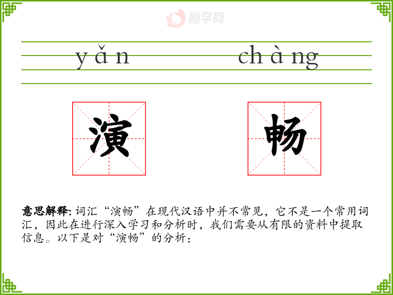 词汇“演畅”在现代汉语中并不常见,它不是一个常用词汇,因此在进行深入学*和分析时,我们需要从有限的资料中提取信息。以下是对“演畅”的分析: