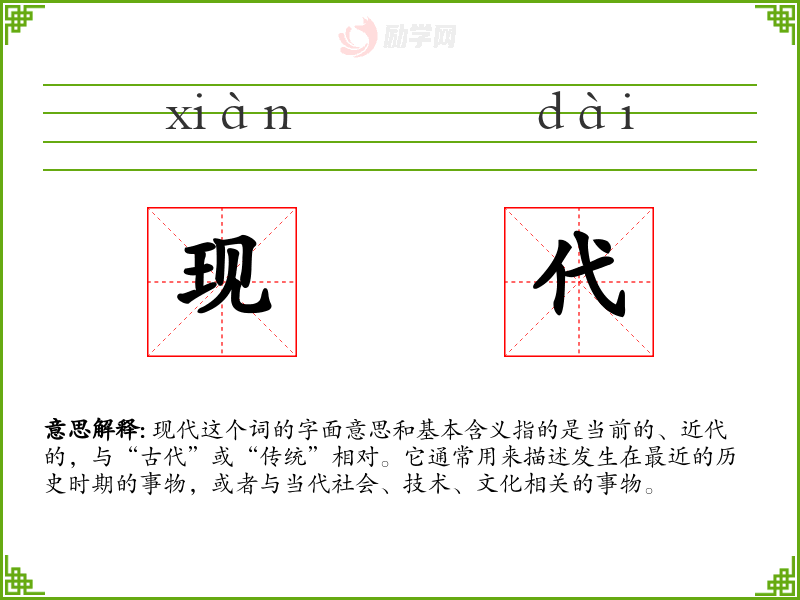 - 反义词:古代、传统、老旧
