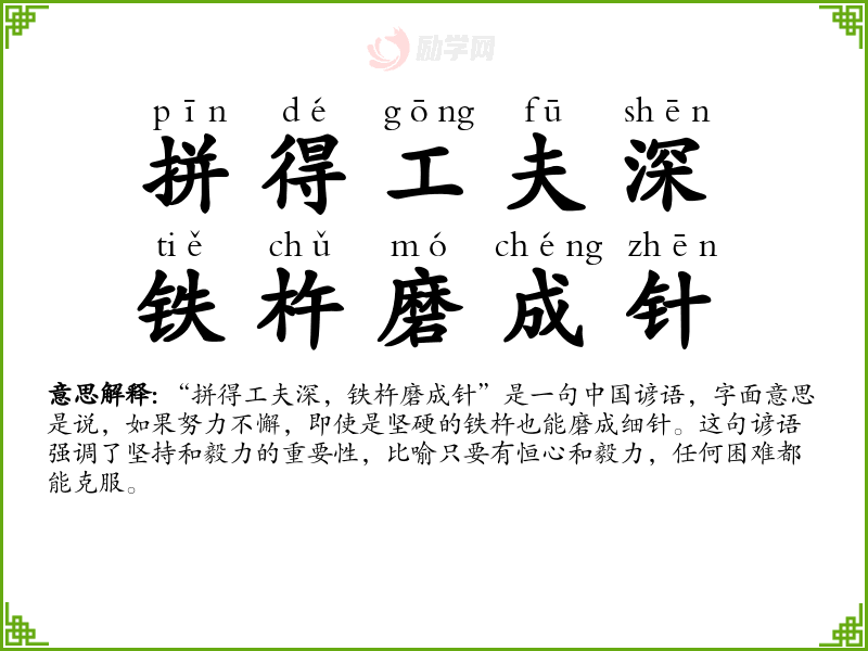 1.拼得工夫深,铁杵磨成针的拼音是什么?拼得工夫深,铁杵磨成针怎么读?