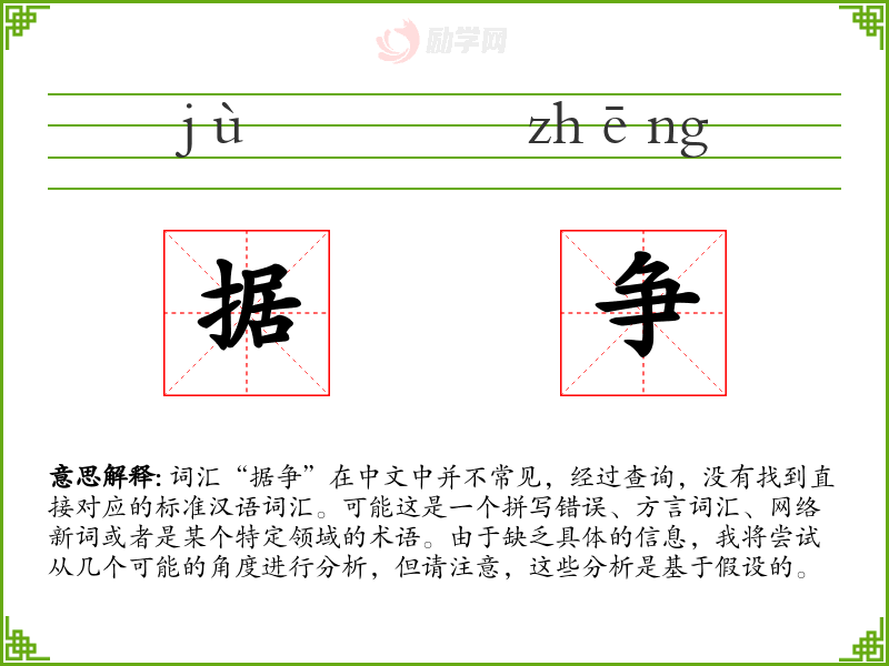 词汇“据争”在中文中并不常见,经过查询,没有找到直接对应的标准汉语词汇。可能这是一个拼写错误、方言词汇、网络新词或者是某个特定领域的术语。由于缺乏具体的信息,我将尝试从几个可能的角度进行分析,但请注意,这些分析是基于假设的。