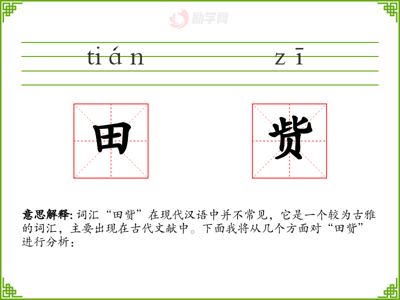 “田赀”是一个具有历史文化价值的词汇,它不仅反映了古代社会的经济状况,也体现了语言的演变和发展。在现代汉语学*中,了解这样的词汇有助于丰富语言知识,增强对传统文化的理解。