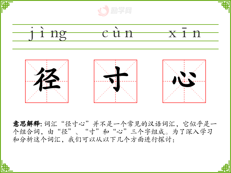 词汇“径寸心”并不是一个常见的汉语词汇,它似乎是一个组合词,由“径”、“寸”和“心”三个字组成。为了深入学习和分析这个词汇,我们可以从以下几个方面进行探讨:
