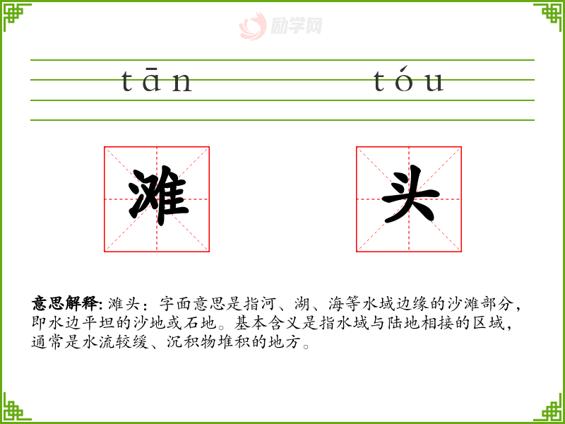 滩头:字面意思是指河、湖、海等水域边缘的沙滩部分,即水边平坦的沙地或石地。基本含义是指水域与陆地相接的区域,通常是水流较缓、沉积物堆积的地方。