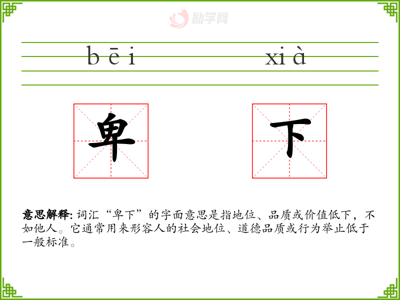 词汇“卑下”的字面意思是指地位、品质或价值低下,不如他人。它通常用来形容人的社会地位、道德品质或行为举止低于一般标准。