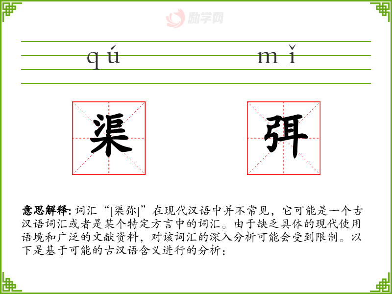 词汇“[渠弥]”在现代汉语中并不常见,它可能是一个古汉语词汇或者是某个特定方言中的词汇。由于缺乏具体的现代使用语境和广泛的文献资料,对该词汇的深入分析可能会受到限制。以下是基于可能的古汉语含义进行的分析: