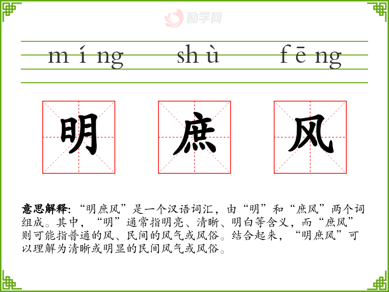 “明庶风”这个词汇在古代文献中并不常见,可能是近代或现代汉语中的一个组合词。它的形成可能受到了“明”和“庶”这两个词的传统含义的影响,逐渐演变成描述民间风俗的词汇。
