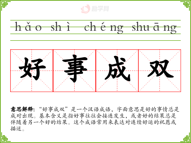 “好事成双”是一个汉语成语,字面意思是好的事情总是成对出现。基本含义是指好事往往会接连发生,或者好的结果总是伴随着另一个好的结果。这个成语常用来表达对连续好运的祝愿或描述。