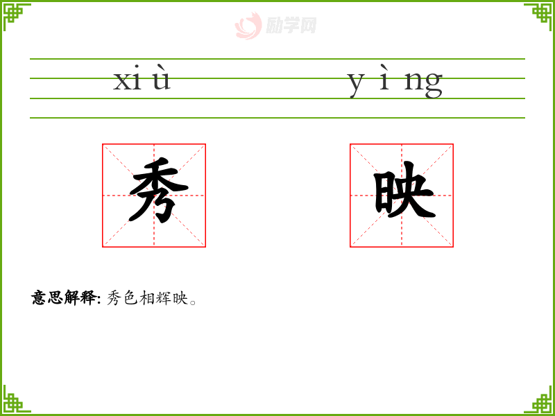 《说文新附》-映,明也。 《通俗文》-日阴曰映。 《后汉书·张衡传》-冠盖相映。 宋·杨万里《晓出净慈寺送林子方》-映日荷花别样红。 《广东军务记》-映日不可逼视。
