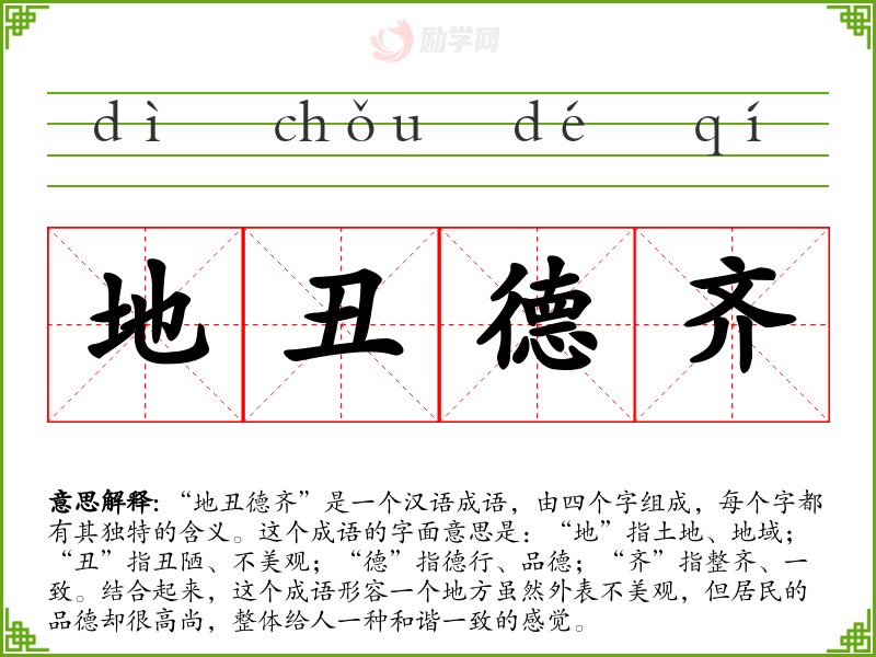 “地丑德齐”是一个汉语成语,由四个字组成,每个字都有其独特的含义。这个成语的字面意思是:“地”指土地、地域;“丑”指丑陋、不美观;“德”指德行、品德;“齐”指整齐、一致。结合起来,这个成语形容一个地方虽然外表不美观,但居民的品德却很高尚,整体给人一种和谐一致的感觉。