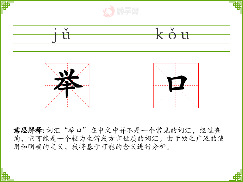 词汇“举口”在中文中并不是一个常见的词汇,经过查询,它可能是一个较为生僻或方言性质的词汇。由于缺乏广泛的使用和明确的定义,我将基于可能的含义进行分析。