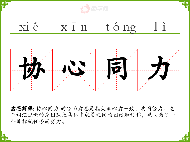 协心同力 是一个强调团队合作和团结的词汇。它不仅在语言表达中具有重要意义,也在文化和组织行为中扮演着关键角色。通过学*和使用这个词汇,我更加明白了团队合作的力量和价值。