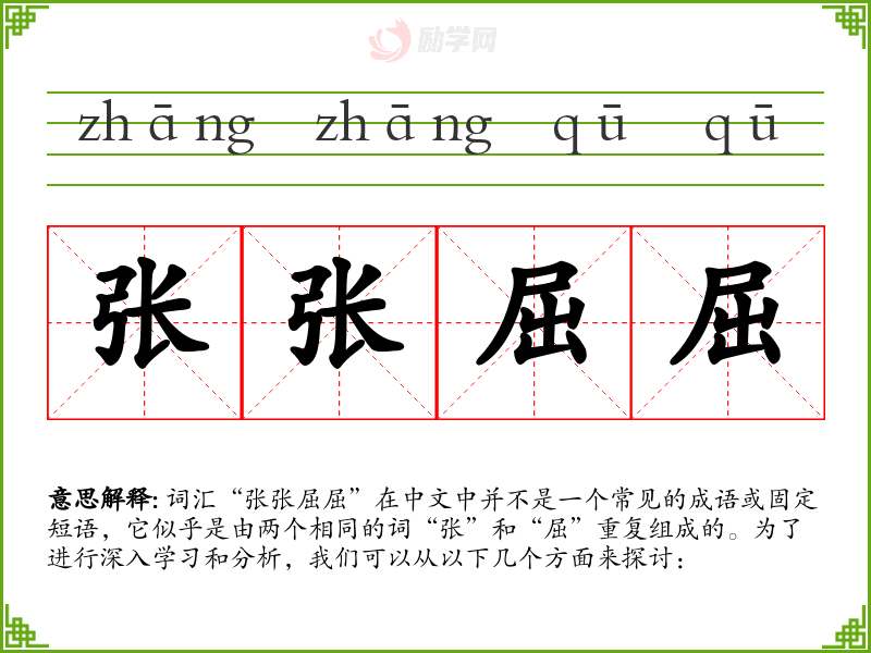 词汇“张张屈屈”在中文中并不是一个常见的成语或固定短语,它似乎是由两个相同的词“张”和“屈”重复组成的。为了进行深入学习和分析,我们可以从以下几个方面来探讨: