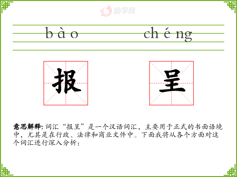 词汇“报呈”是一个汉语词汇,主要用于正式的书面语境中,尤其是在行政、法律和商业文件中。下面我将从各个方面对这个词汇进行深入分析: